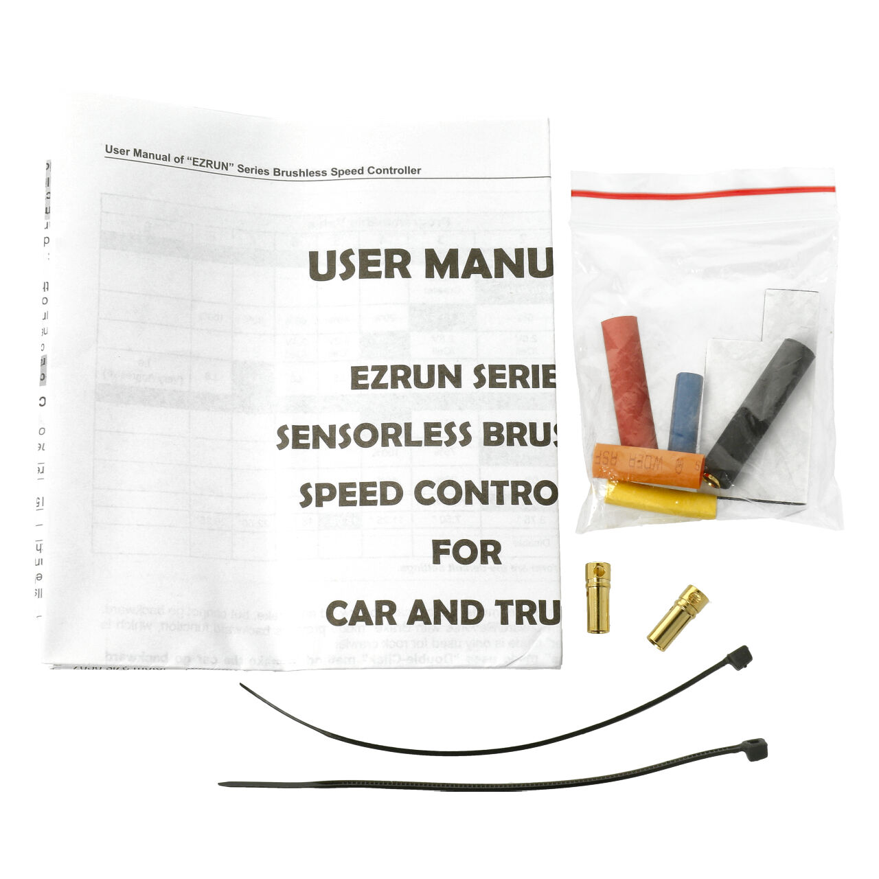 Set bestehend aus einem Ezrun 60A-Regler und diversem Zubehör für den Einsatz in 1/10 RC-Autos.