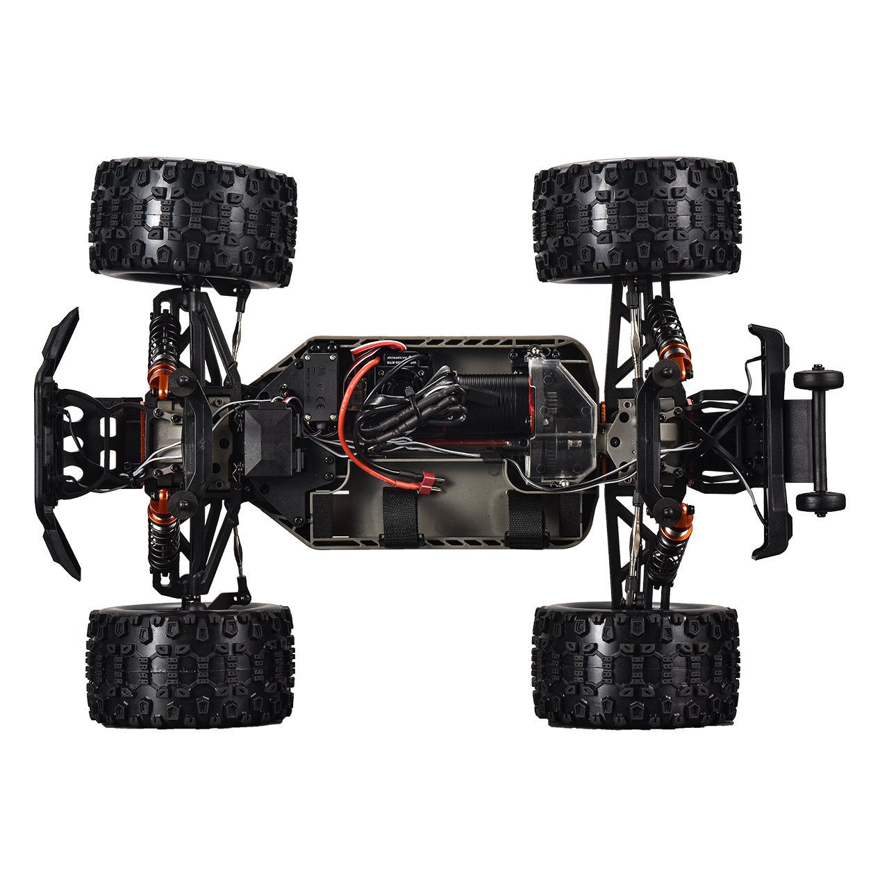 Das hochsetige Nylon-Chassis mit Aluminium-Schutzplatten vorne und hinten bietet extreme Kontrolle und mechanische Robustheit. Die Pivot-Ball-Federung, ölgefüllte Aluminium-Stoßdämpfer und hochwertigen Kugellager sorgen für Performance – egal ob im Gelände oder auf der Straße. Front- und Heckstoßfänger absorbieren Stöße effektiv, und LED-Front-/Dach-Lichtleiste bringen spannende Optik und bessere Sichtbarkeit.